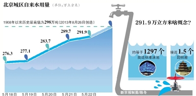 北京自来水集团统计显示,5月下旬,北京自来水供水量明显超过近年来的5月同期供水量,达到了往年7月份用水高峰期的供水量。5月18日城区供水量达到276.3万立方米,此后几天持续上升。
